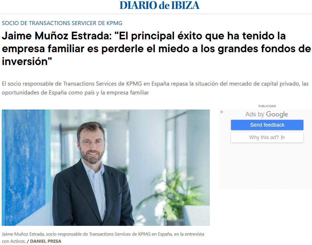 Jaime Muñoz Estrada (Málaga, 1975), socio responsable de Transactions Services de KPMG en España, atiende a ACTIVOS, el vertical económico de Prensa Ibérica, para repasar la situación del mercado del capital privado, la situación de la empresa familiar y el ecosistema de gestoras de fondos de inversión español.