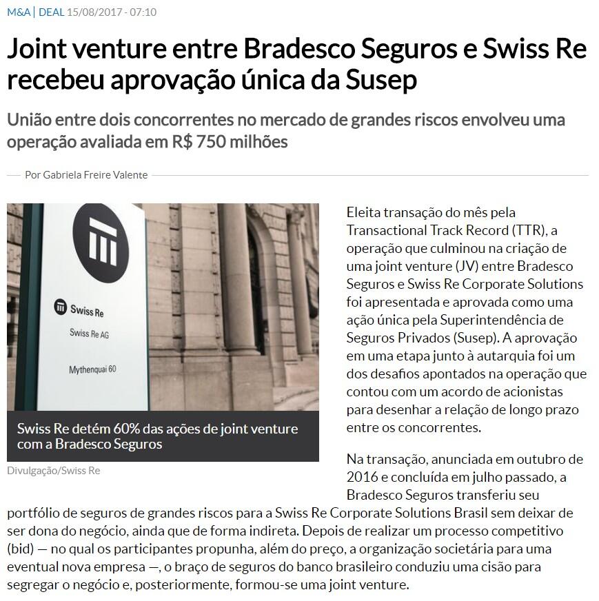 Eleita transação do mês pela Transactional Track Record (TTR), a operação que culminou na criação de uma joint venture (JV) entre Bradesco Seguros e Swiss Re Corporate Solutions foi apresentada e aprovada como uma ação única pela Superintendência de Seguros Privados (Susep). A aprovação em uma etapa junto à autarquia foi um dos desafios apontados na operação que contou com um acordo de acionistas para desenhar a relação de longo prazo entre os concorrentes.