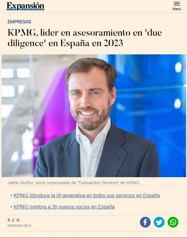 "A pesar de la complejidad del entorno macroeconómico y la incertidumbre que ha marcado el 2023, desde KPMG hemos tenido la oportunidad de asesorar algunas de las transacciones más relevantes del año y seguir ofreciendo calidad diferencial a nuestros clientes, posicionando a nuestro equipo de Deal Advisory como asesor de referencia en due diligence en el mercado", señala Jaime Muñoz, socio responsable de Transaction Services de KPMG en España.