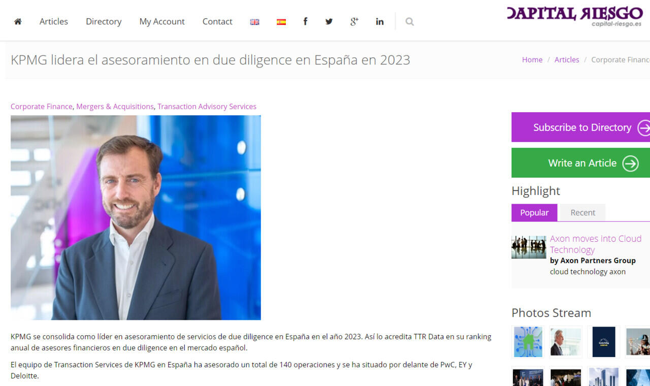"A pesar la complejidad del entorno macroeconómico y la incertidumbre que ha marcado el 2023, desde KPMG hemos tenido la oportunidad asesorar algunas de las transacciones más relevantes del año y seguir ofreciendo calidad diferencial a nuestros clientes, posicionando a nuestro equipo de Deal Advisory como asesor de referencia en due diligence en el mercado" ha señalado Jaime Muñoz, Socio responsable de Transaction Services de KPMG en España