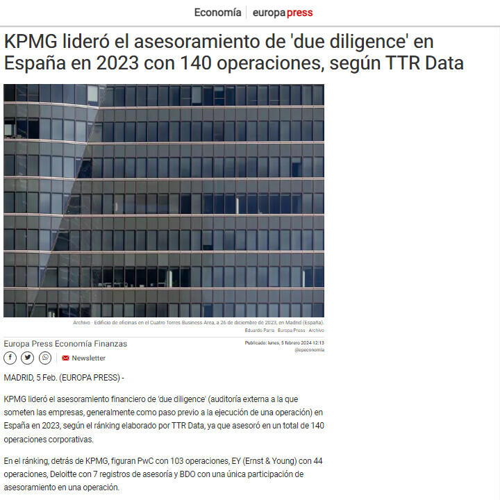 KPMG lideró el asesoramiento financiero de 'due diligence' (auditoría externa a la que someten las empresas, generalmente como paso previo a la ejecución de una operación) en España en 2023, según el ránking elaborado por TTR Data, ya que asesoró en un total de 140 operaciones corporativas.