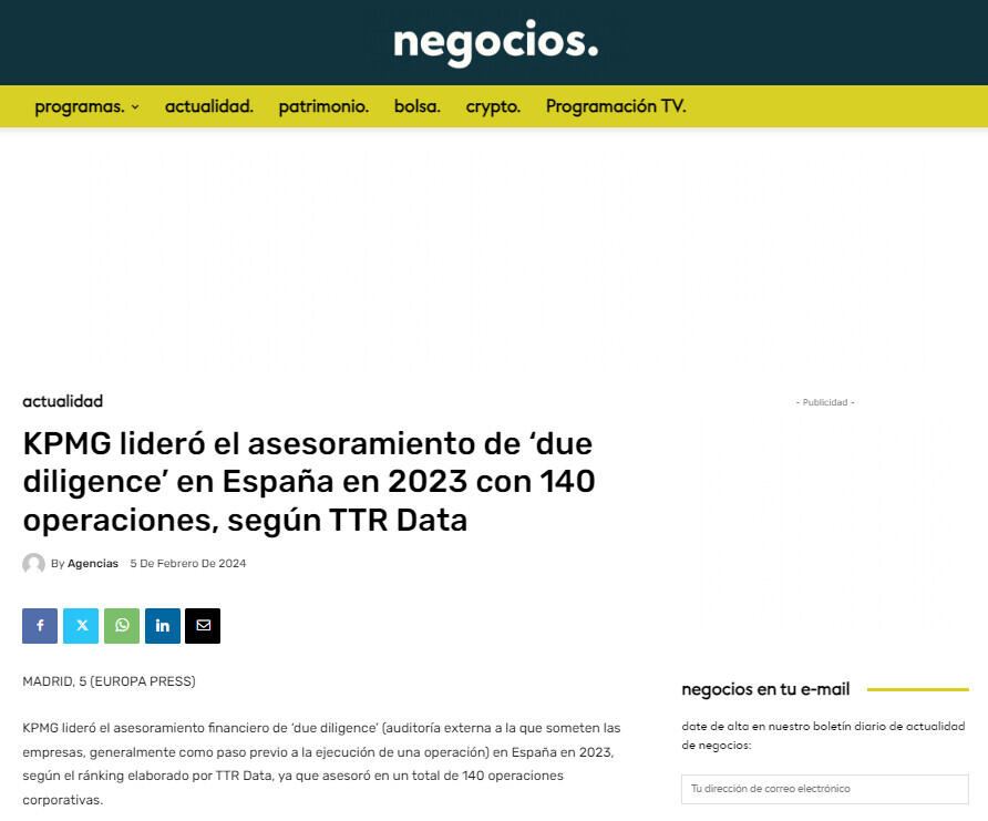 KPMG lideró el asesoramiento de ‘due diligence’ en España en 2023 con 140 operaciones, según TTR Data