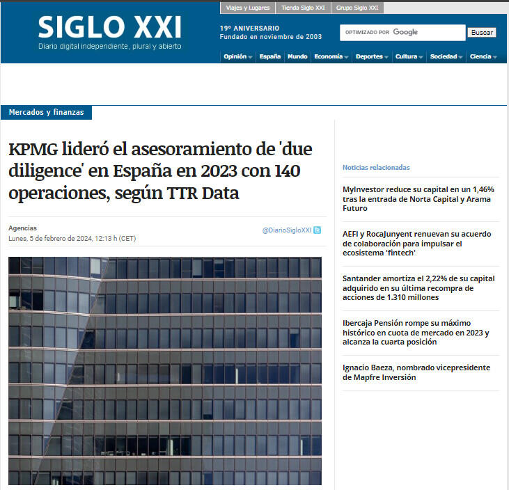 KPMG lideró el asesoramiento financiero de 'due diligence' (auditoría externa a la que someten las empresas, generalmente como paso previo a la ejecución de una operación) en España en 2023, según el ránking elaborado por TTR Data, ya que asesoró en un total de 140 operaciones corporativas.