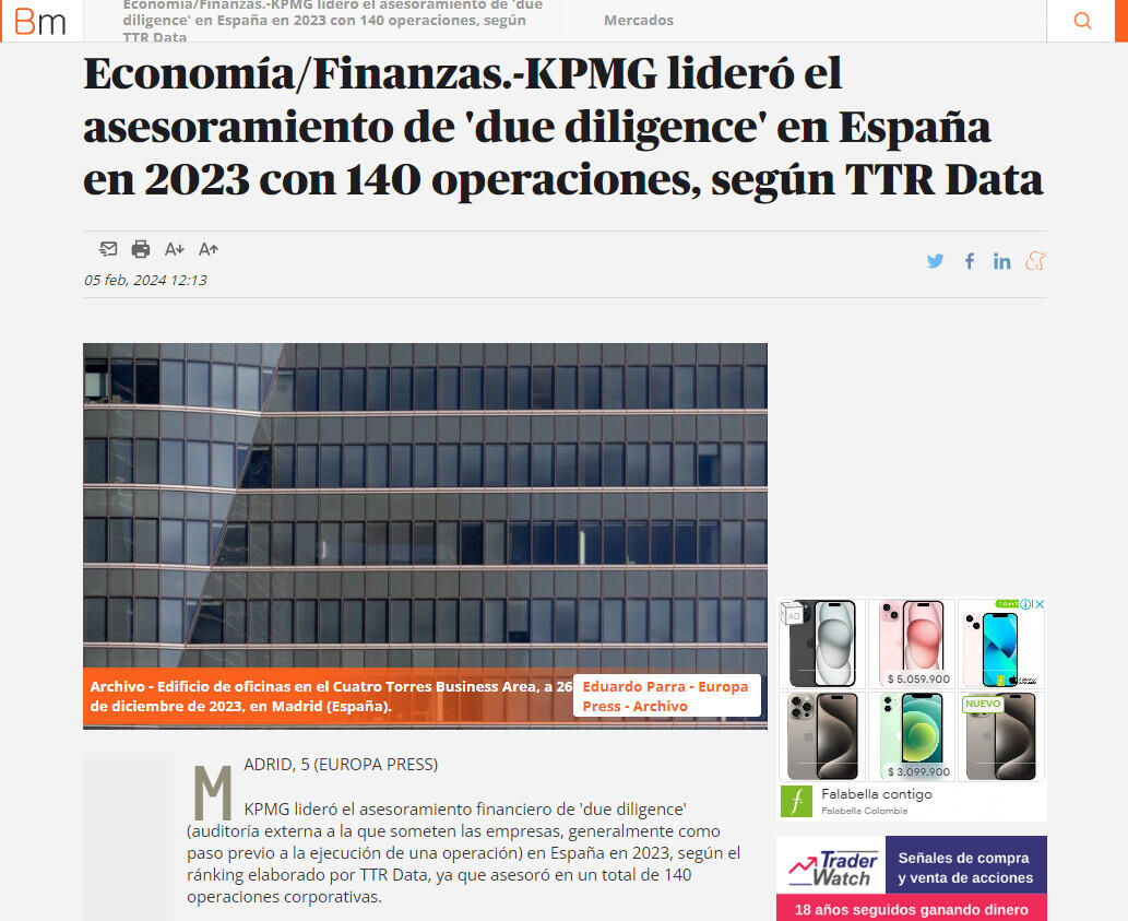 KPMG lideró el asesoramiento de 'due diligence' en España en 2023 con 140 operaciones, según TTR Data