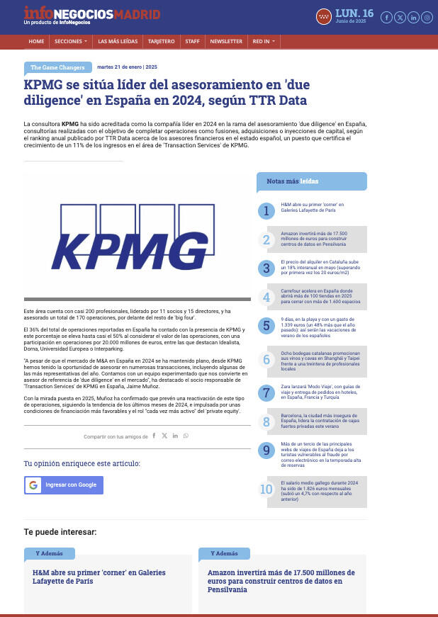 KPMG se sitúa líder del asesoramiento en 'due diligence' en España en 2024, según TTR Data
