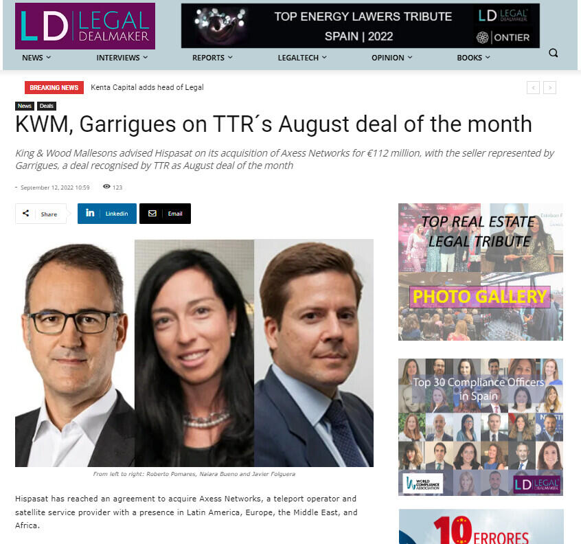 King & Wood Mallesons advised Hispasat on its acquisition of Axess Networks for €112 million, with the seller represented by Garrigues, a deal recognised by TTR as August deal of the month