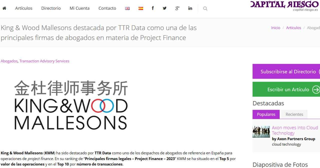 King & Wood Mallesons (KWM) ha sido destacado por TTR Data como uno de los despachos de abogados de referencia en España para operaciones de project finance. En su ranking de “Principales firmas legales – Project Finance – 2023” KWM se ha situado en el Top 5 por valor de las operaciones y en el Top 10 por número de transacciones.