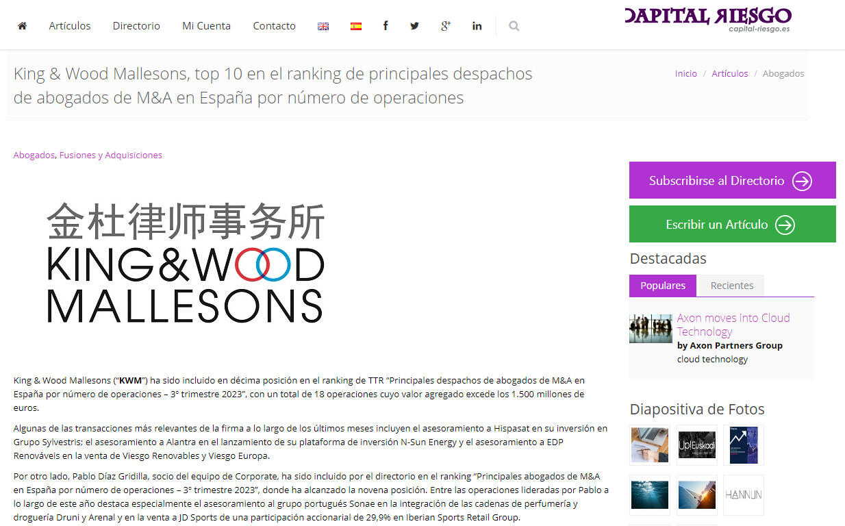 King & Wood Mallesons (“KWM”) ha sido incluido en décima posición en el ranking de TTR “Principales despachos de abogados de M&A en España por número de operaciones – 3º trimestre 2023”, con un total de 18 operaciones cuyo valor agregado excede los 1.500 millones de euros.