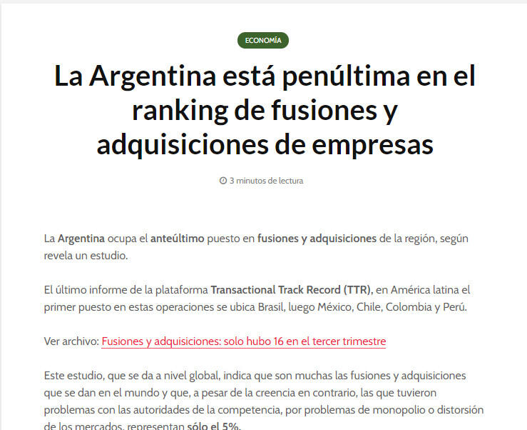 La Argentina está penúltima en el ranking de fusiones y adquisiciones de empresas