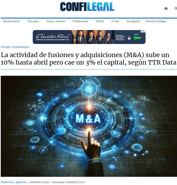 La actividad de fusiones y adquisiciones (M&A) sube un 10% hasta abril pero cae un 3% el capital, según TTR Data