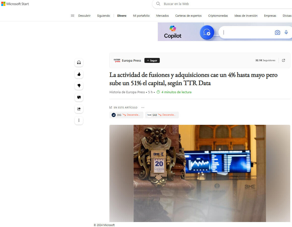 El mercado transaccional español ha registrado hasta mayo un total de 1.225 acuerdos de fusiones y adquisiciones, lo que supone un descenso del 4% respecto al mismo periodo de 2023, aunque, por contra, el importe de estas adquisiciones en lo que va de año ha sido de 44.615 millones de euros, un 51% más del capital movilizado en los cinco meses de 2023, según el informe divulgado este viernes por TTR Data.