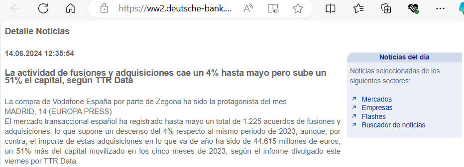 La operación que TTR Data ha seleccionado como destacada en el mes de mayo ha sido la adquisición de la totalidad de Vodafone España por parte de la empresa de telecomunicaciones británica Zegona, en tanto que la transacción está valorada en aproximadamente 5.000 millones de euros.