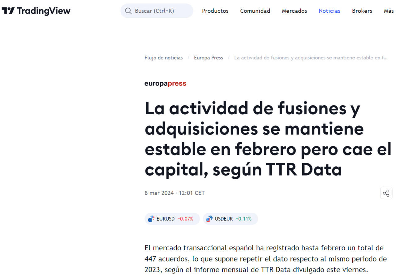 La actividad de fusiones y adquisiciones se mantiene estable en febrero pero cae el capital, según TTR Data