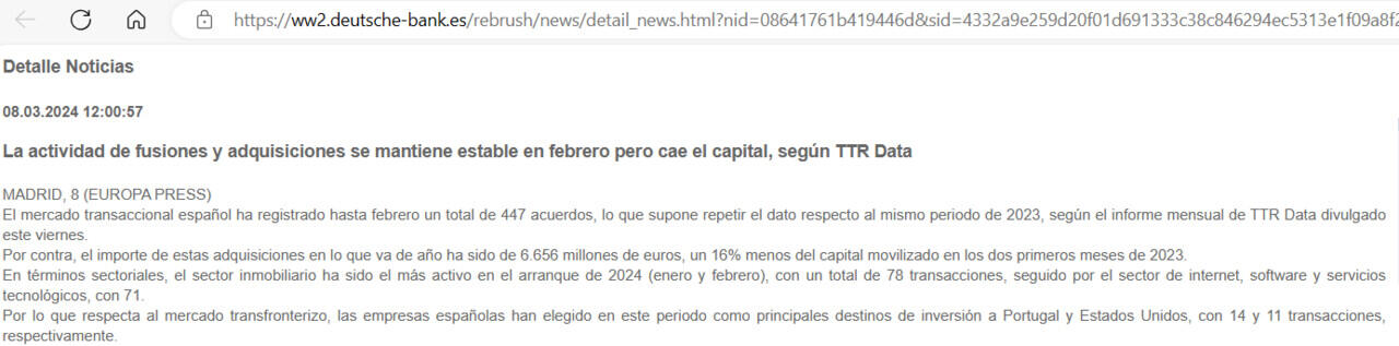 El mercado transaccional español ha registrado hasta febrero un total de 447 acuerdos, lo que supone repetir el dato respecto al mismo periodo de 2023, según el informe mensual de TTR Data divulgado este viernes.