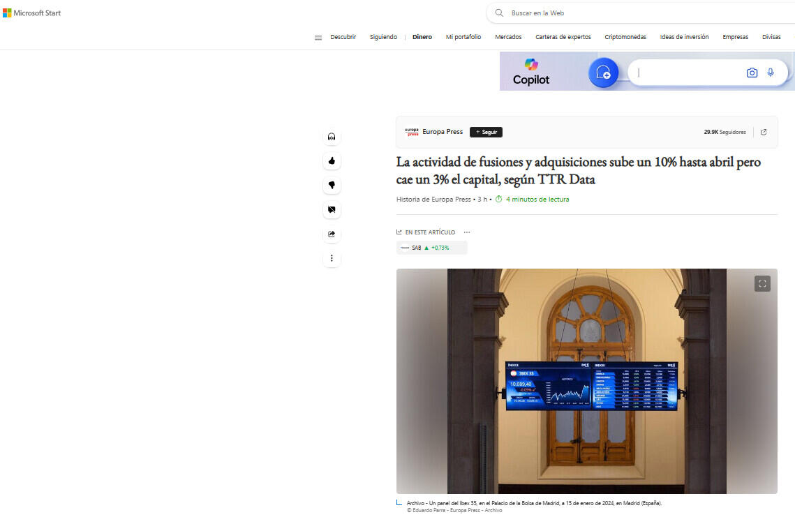 El mercado transaccional español ha registrado hasta abril un total de 962 acuerdos de fusiones y adquisiciones, lo que supone un ascenso del 10% respecto al mismo periodo de 2023, aunque, por contra, el importe de estas adquisiciones en lo que va de año ha sido de 26.146 millones de euros, un 3% menos del capital movilizado en los cuatro primeros meses de 2023, según el informe divulgado este martes por TTR Data.