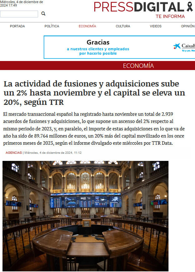 El mercado transaccional español ha registrado hasta noviembre un total de 2.939 acuerdos de fusiones y adquisiciones, lo que supone un ascenso del 2% respecto al mismo periodo de 2023, y, en paralelo, el importe de estas adquisiciones en lo que va de año ha sido de 89.764 millones de euros, un 20% más del capital movilizado en los once primeros meses de 2023, según el informe divulgado este miércoles por TTR Data.