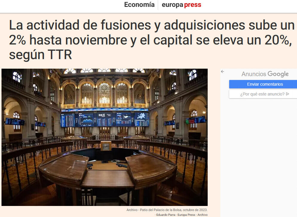 El mercado transaccional español ha registrado hasta noviembre un total de 2.939 acuerdos de fusiones y adquisiciones, lo que supone un ascenso del 2% respecto al mismo periodo de 2023, y, en paralelo, el importe de estas adquisiciones en lo que va de año ha sido de 89.764 millones de euros, un 20% más del capital movilizado en los once primeros meses de 2023, según el informe divulgado este miércoles por TTR Data.