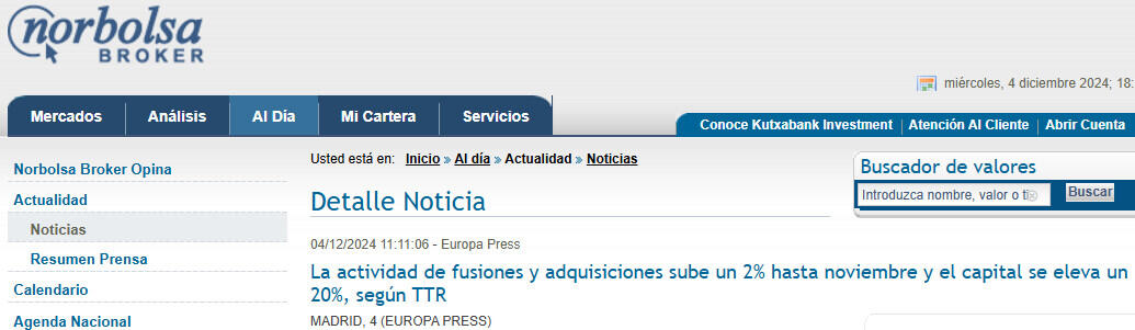 El mercado transaccional español ha registrado hasta noviembre un total de 2.939 acuerdos de fusiones y adquisiciones, lo que supone un ascenso del 2% respecto al mismo periodo de 2023, y, en paralelo, el importe de estas adquisiciones en lo que va de año ha sido de 89.764 millones de euros, un 20% más del capital movilizado en los once primeros meses de 2023, según el informe divulgado este miércoles por TTR Data.