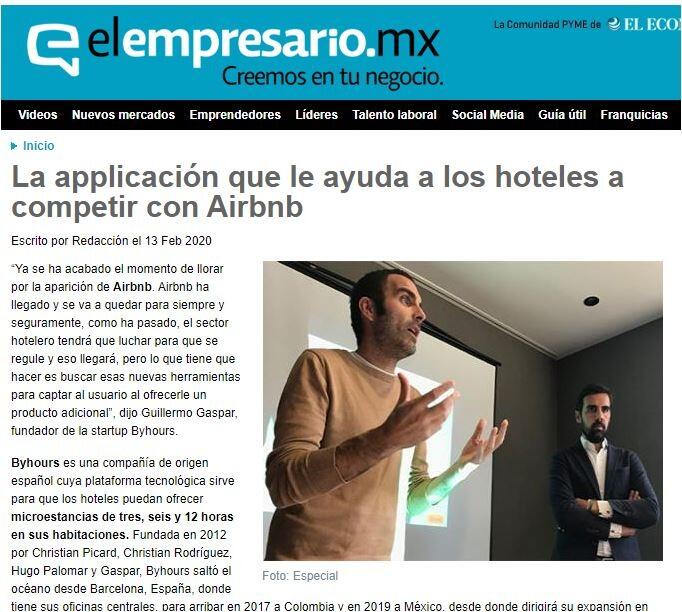 Byhours es una compañía de origen español cuya plataforma tecnológica sirve para que los hoteles puedan ofrecer microestancias de tres, seis y 12 horas en sus habitaciones. Fundada en 2012 por Christian Picard, Christian Rodríguez, Hugo Palomar y Gaspar, Byhours saltó el océano desde Barcelona, España, donde tiene sus oficinas centrales, para arribar en 2017 a Colombia y en 2019 a México, desde donde dirigirá su expansión en América Latina y Estados Unidos.