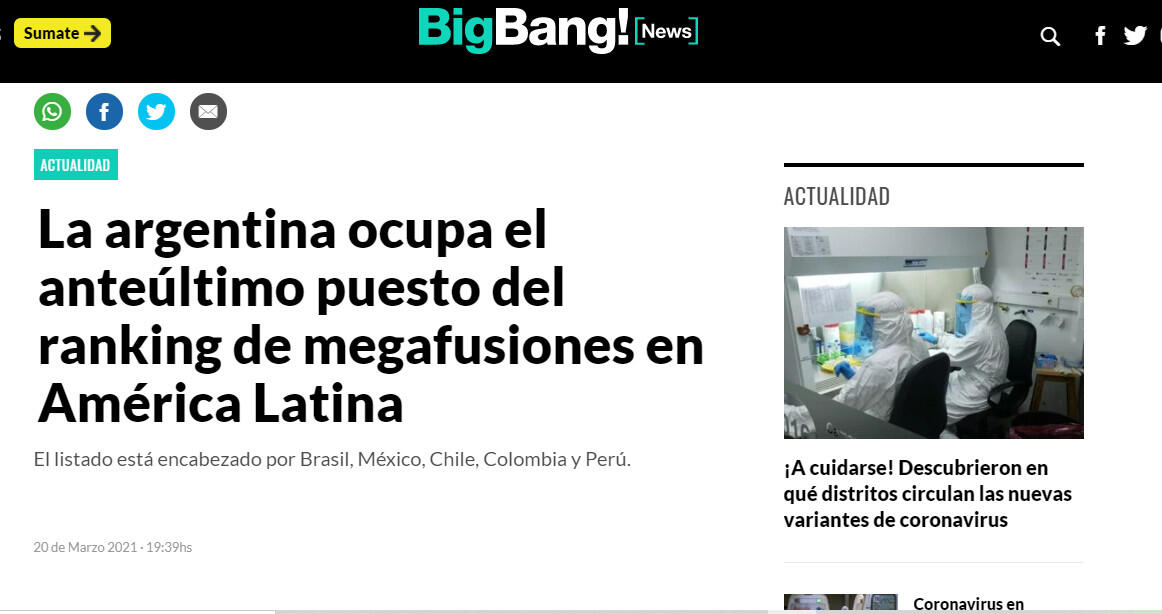 La argentina ocupa el anteúltimo puesto del ranking de megafusiones en América Latina