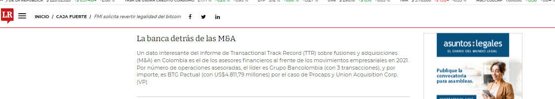 Un dato interesante del informe de Transactional Track Record (TTR) sobre fusiones y adquisiciones (M&A) en Colombia es el de los asesores financieros al frente de los movimientos empresariales en 2021. Por número de operaciones asesoradas, el líder es Grupo Bancolombia (con 3 transacciones), y por importe, es BTG Pactual (con US$4.811,79 millones) por el caso de Procaps y Union Acquisition Corp. (VP)