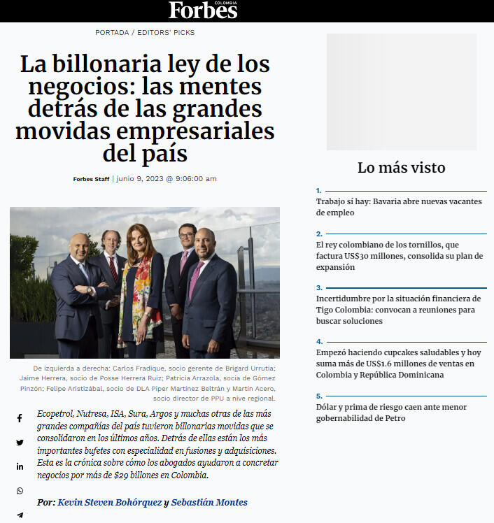En Colombia, muchos negocios se han dado en las últimas vigencias y en todos ellos los abogados fueron los protagonistas. Tres meses antes de que se lanzará la primera oferta por Nutresa, Ecopetrol sorprendió al mercado con la noticia de que comprarían el 51,4% de ISA, lo que la convertía en el conglomerado energético más importante de América Latina. Quién estaba detrás de la estructuración y transacción era Posse Herrera Ruiz, una firma que se le midió a cerrar un negocio por $14,2 billones (más de US$3.100 millones).