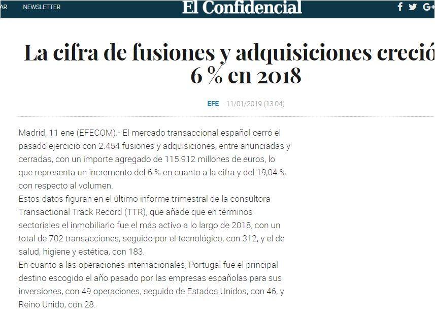 Estos datos figuran en el último informe trimestral de la consultora Transactional Track Record (TTR), que añade que en términos sectoriales el inmobiliario fue el más activo a lo largo de 2018, con un total de 702 transacciones, seguido por el tecnológico, con 312, y el de salud, higiene y estética, con 183.
