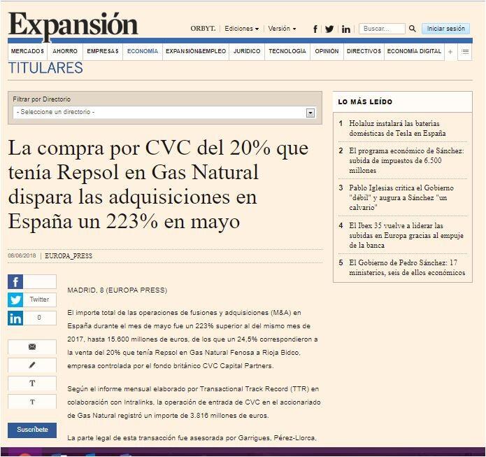 La compra por CVC del 20% que tenía Repsol en Gas Natural dispara las adquisiciones en España un 223% en mayo