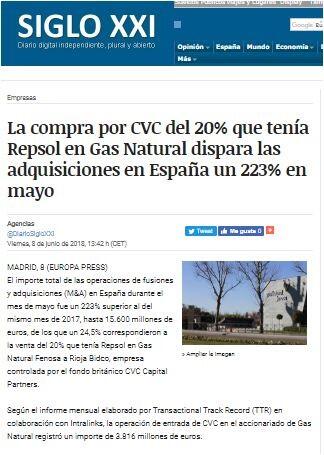 El importe total de las operaciones de fusiones y adquisiciones (M&A) en España durante el mes de mayo fue un 223% superior al del mismo mes de 2017, hasta 15.600 millones de euros, de los que un 24,5% correspondieron a la venta del 20% que tenía Repsol en Gas Natural Fenosa a Rioja Bidco, empresa controlada por el fondo británico CVC Capital Partners.