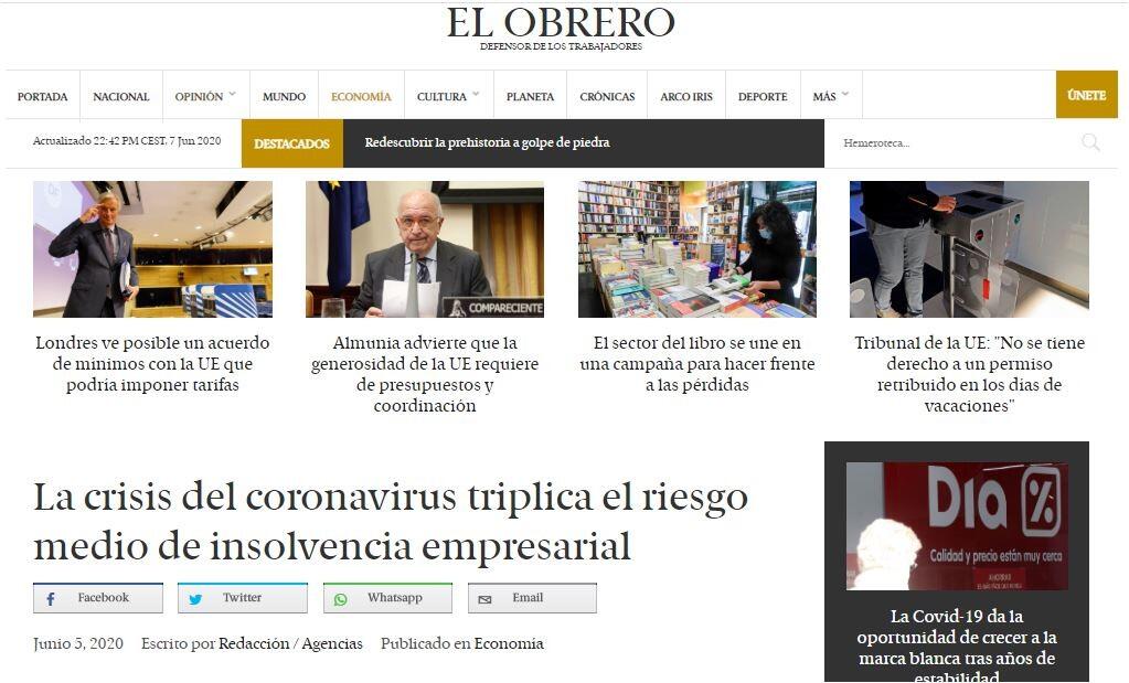 El impacto de la crisis del covid-19 podría triplicar el riesgo medio de insolvencia de las empresas españolas, que se multiplicaría hasta por ocho veces en los sectores más afectados, como la hostelería o el comercio.