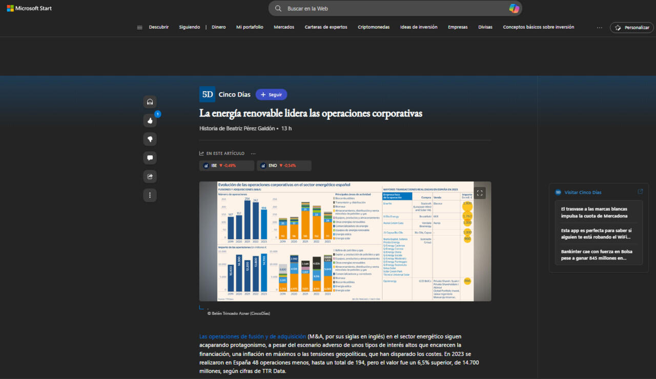 Las operaciones de fusión y de adquisición (M&A, por sus siglas en inglés) en el sector energético siguen acaparando protagonismo, a pesar del escenario adverso de unos tipos de interés altos que encarecen la financiación, una inflación en máximos o las tensiones geopolíticas, que han disparado los costes. En 2023 se realizaron en España 48 operaciones menos, hasta un total de 194, pero el valor fue un 6,5% superior, de 14.700 millones, según cifras de TTR Data.