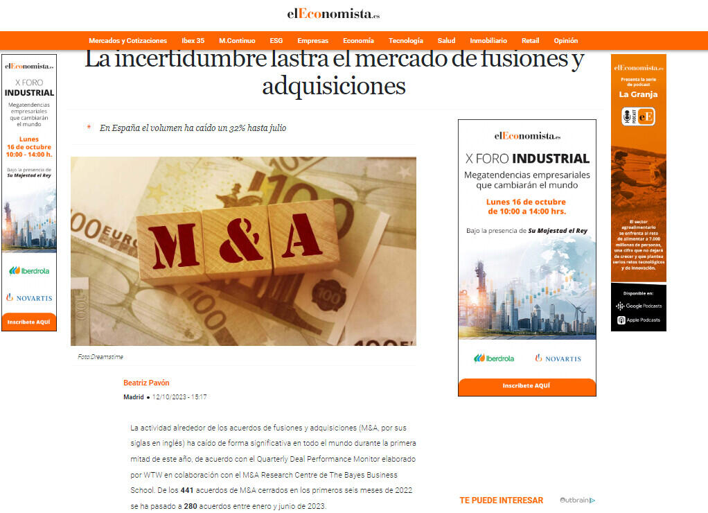La actividad alrededor de los acuerdos de fusiones y adquisiciones (M&A, por sus siglas en inglés) ha caído de forma significativa en todo el mundo durante la primera mitad de este año, de acuerdo con el Quarterly Deal Performance Monitor elaborado por WTW en colaboración con el M&A Research Centre de The Bayes Business School. De los 441 acuerdos de M&A cerrados en los primeros seis meses de 2022 se ha pasado a 280 acuerdos entre enero y junio de 2023.