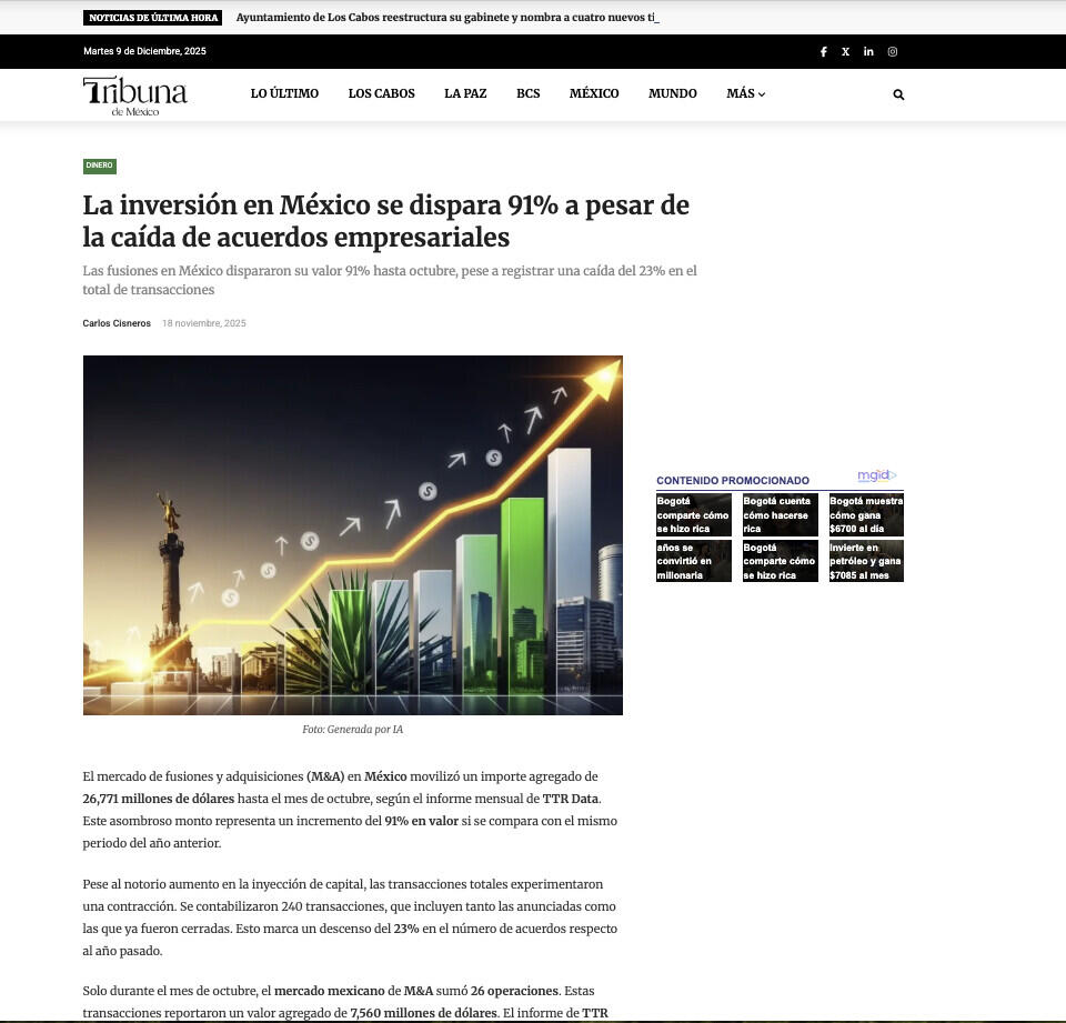 Solo durante el mes de octubre, el mercado mexicano de M&A sumó 26 operaciones. Estas transacciones reportaron un valor agregado de 7,560 millones de dólares. El informe de TTR Data revela cómo el capital se concentra en movimientos de alto impacto, manteniendo el dinamismo a pesar de la disminución en el volumen.