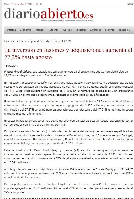 La inversión en fusiones y adquisiciones aumenta el 27,2% hasta agosto