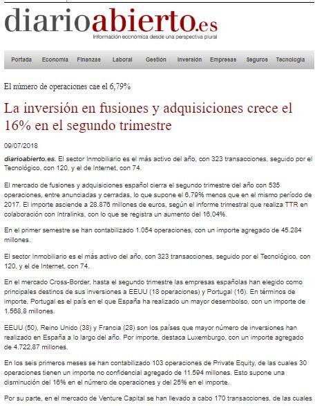 El mercado de fusiones y adquisiciones español cierra el segundo trimestre del año con 535 operaciones, entre anunciadas y cerradas, lo que supone el 6,79% menos que en el mismo período de 2017. El importe asciende a 28.876 millones de euros, según el informe trimestral que realiza TTR en colaboración con Intralinks, con lo que se registra un aumento del 16,04%.
