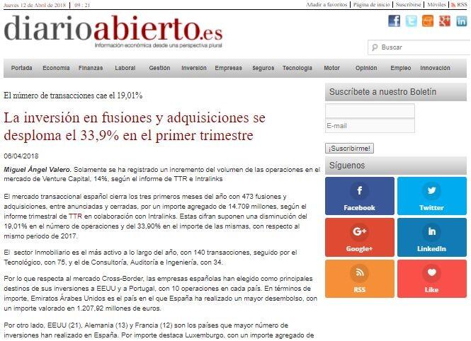 El mercado transaccional español cierra los tres primeros meses del año con 473 fusiones y adquisiciones, entre anunciadas y cerradas, por un importe agregado de 14.709 millones, según el informe trimestral de TTR en colaboración con Intralinks. Estas cifran suponen una disminución del 19,01% en el número de operaciones y del 33,90% en el importe de las mismas, con respecto al mismo periodo de 2017.