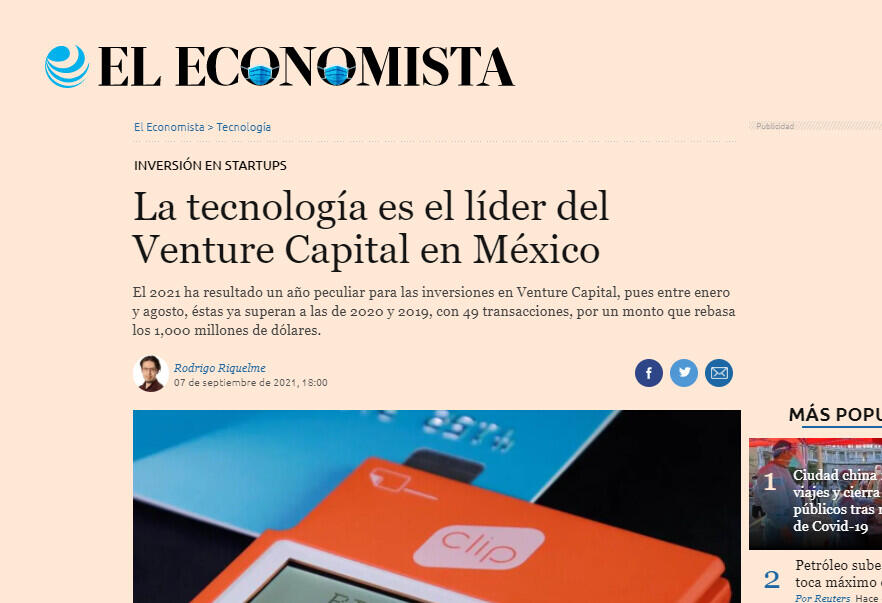Las startups de tecnología son las favoritas de los inversionistas de Venture Capital en México, de acuerdo con la firma de análisis de mercado Transactional Track Record (TTR).En 2021, se han registrado 49 rondas de inversión de Venture Capital en empresas de tecnología en México por un monto total de 1,154 millones de dólares, lo que hace que las inversiones en este sector superen por mucho a las de los sectores financiero, transporte y alimentación.