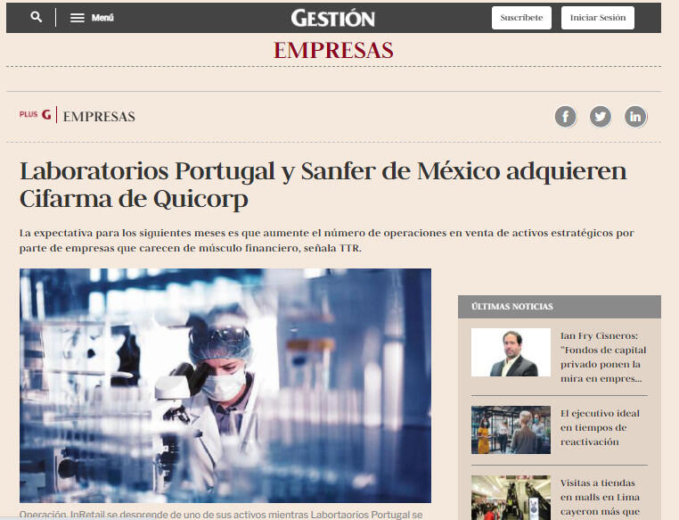 El grupo mexicano Sanfer abrochó la compra del laboratorio peruano Cifarma, que estaba en manos de la local Quicorp, informó el Diario Gestión citando como fuente un reporte de M&A elaborado por la consultora TTR. No se difundieron detalles financieros de la operación.