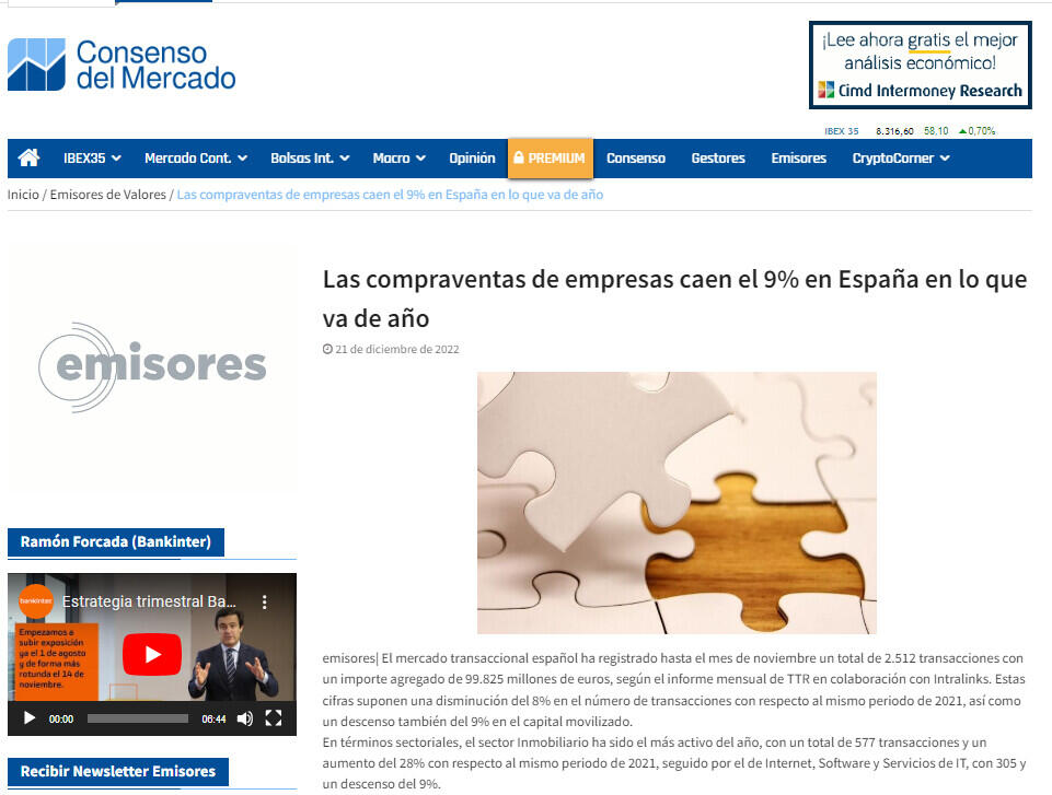 emisores| El mercado transaccional español ha registrado hasta el mes de noviembre un total de 2.512 transacciones con un importe agregado de 99.825 millones de euros, según el informe mensual de TTR en colaboración con Intralinks. Estas cifras suponen una disminución del 8% en el número de transacciones con respecto al mismo periodo de 2021, así como un descenso también del 9% en el capital movilizado.