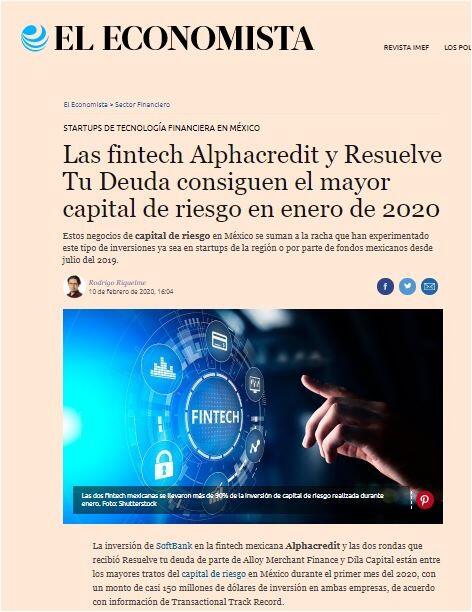 La inversión de SoftBank en la fintech mexicana Alphacredit y las dos rondas que recibió Resuelve tu deuda de parte de Alloy Merchant Finance y Dila Capital están entre los mayores tratos del capital de riesgo en México durante el primer mes del 2020, con un monto de casi 150 millones de dólares de inversión en ambas empresas, de acuerdo con información de Transactional Track Record.