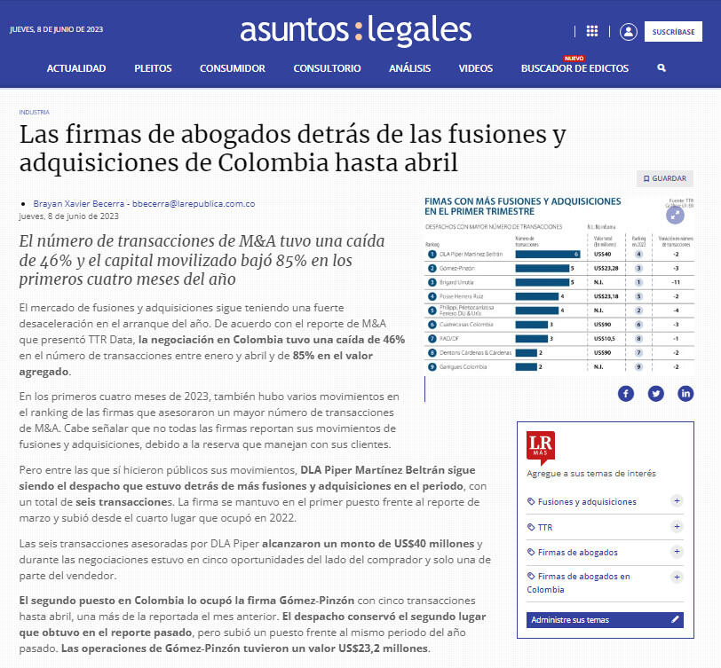 El segundo puesto en Colombia lo ocupó la firma Gómez-Pinzón con cinco transacciones hasta abril, una más de la reportada el mes anterior. El despacho conservó el segundo lugar que obtuvo en el reporte pasado, pero subió un puesto frente al mismo periodo del año pasado. Las operaciones de Gómez-Pinzón tuvieron un valor US$23,2 millones.