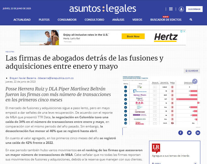 Posse Herrera Ruiz y DLA Piper Martínez Beltrán fueron las firmas con más número de transacciones en los primeros cinco meses
