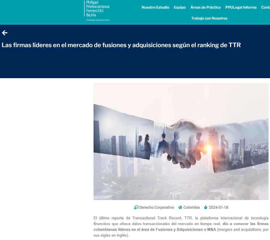 El último reporte de Transactional Track Record, TTR, la plataforma internacional de tecnología financiera que ofrece datos transaccionales del mercado en tiempo real, dio a conocer las firmas colombianas líderes en el área de Fusiones y Adquisiciones o M&A (mergers and acquisitions, por sus siglas en inglés).
