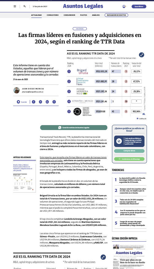 Brigard Urrutia es la firma líder en ambos listados. En 2024 tuvo un total de 47 transacciones, por un valor de US$2.032,28 millones. En volumen de operaciones, el segundo lugar lo tuvo Philippi Prietocarrizosa Ferrero DU & Uría Colombia, con US$1,882.91 millones; mientras que el podio lo completó Posse Herrera Ruiz, con un volumen de US$1,397.28 millones.