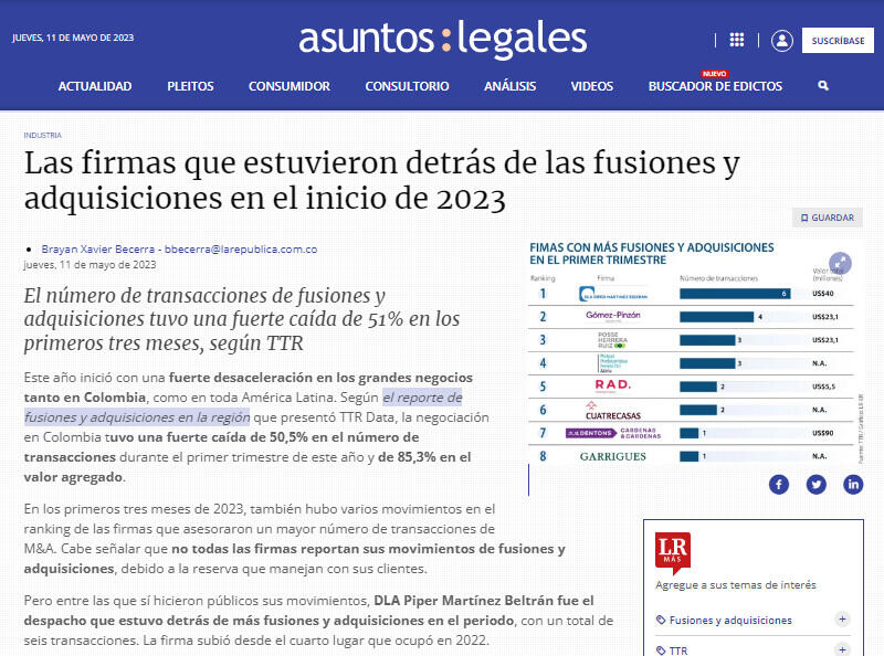 Posse Herrera Ruiz subió del quinto al tercer lugar en los primeros tres meses de 2023. Pero la firma registró solo tres transacciones, dos menos que el mismo periodo del año pasado. Las operaciones tuvieron un valor similar de Gómez-Pinzón de US$23,1 millones y estuvo en dos oportunidades del lado del vendedor y solo una de parte del comprador.