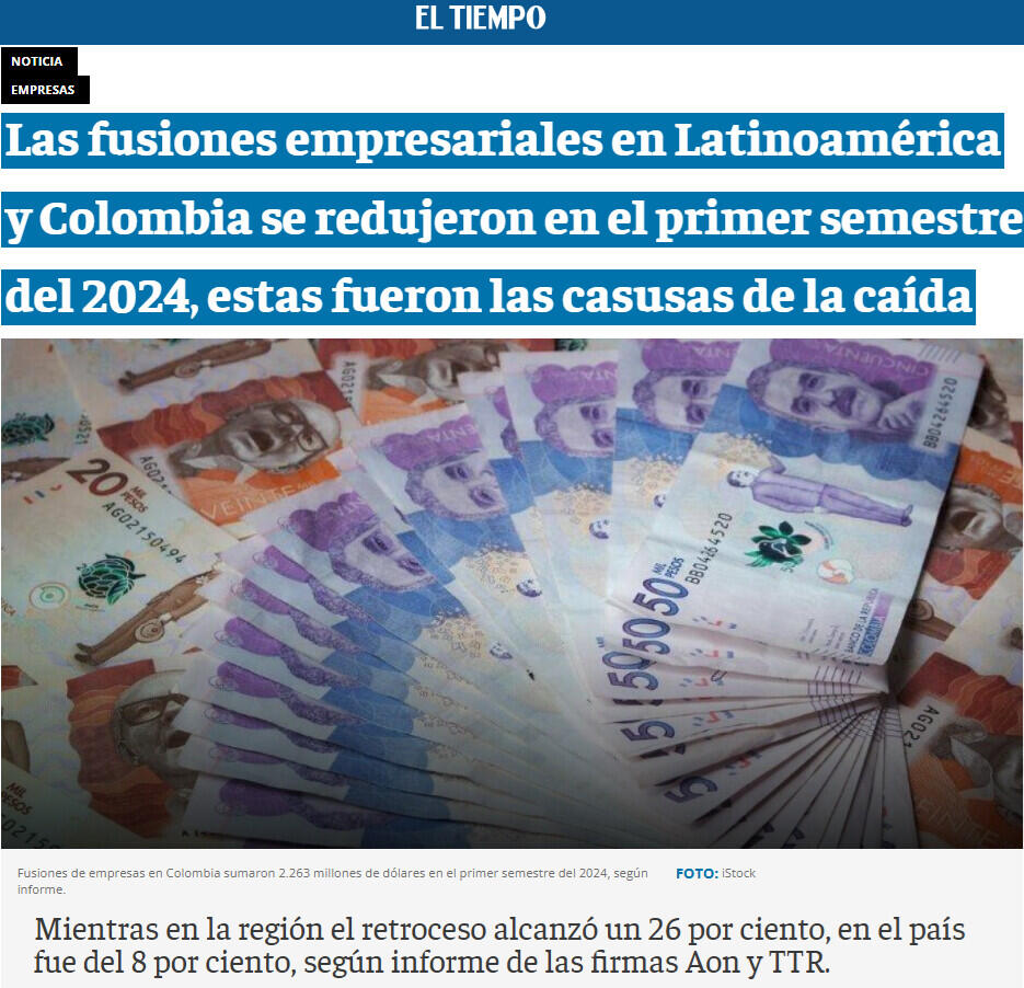 En el mismo se indica que al cierre del primer semestre del presente año 2024, el mercado de fusiones y adquisiciones (M&A, por sus siglas en inglés) de Colombia se redujo 8 por ciento, totalizando 124 transacciones por valor de 2.263 millones de dólares, monto inferior en un 9,7 por ciento respecto a un año atrás.
