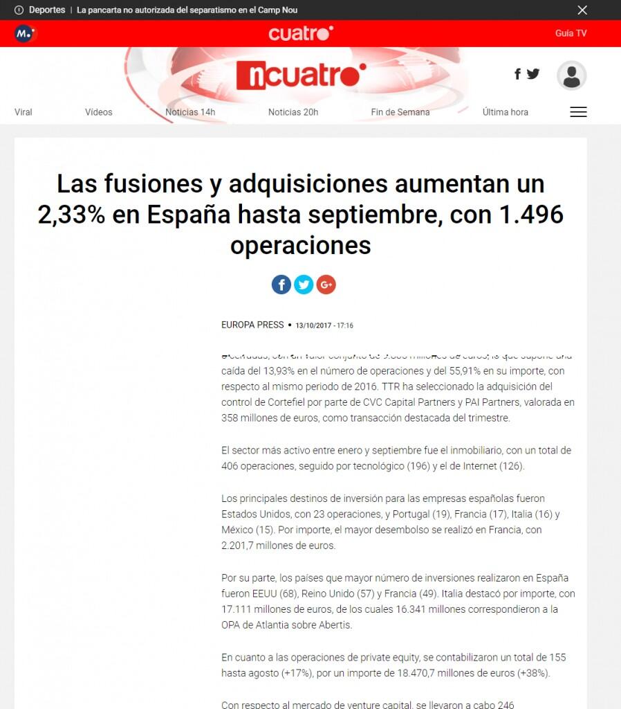 En el tercer trimestre se contabilizaron 420 fusiones y adquisiciones anunciadas o cerradas, con un valor conjunto de 9.865 millones de euros, lo que supone una caída del 13,93% en el número de operaciones y del 55,91% en su importe, con respecto al mismo periodo de 2016. TTR ha seleccionado la adquisición del control de Cortefiel por parte de CVC Capital Partners y PAI Partners, valorada en 358 millones de euros, como transacción destacada del trimestre.
