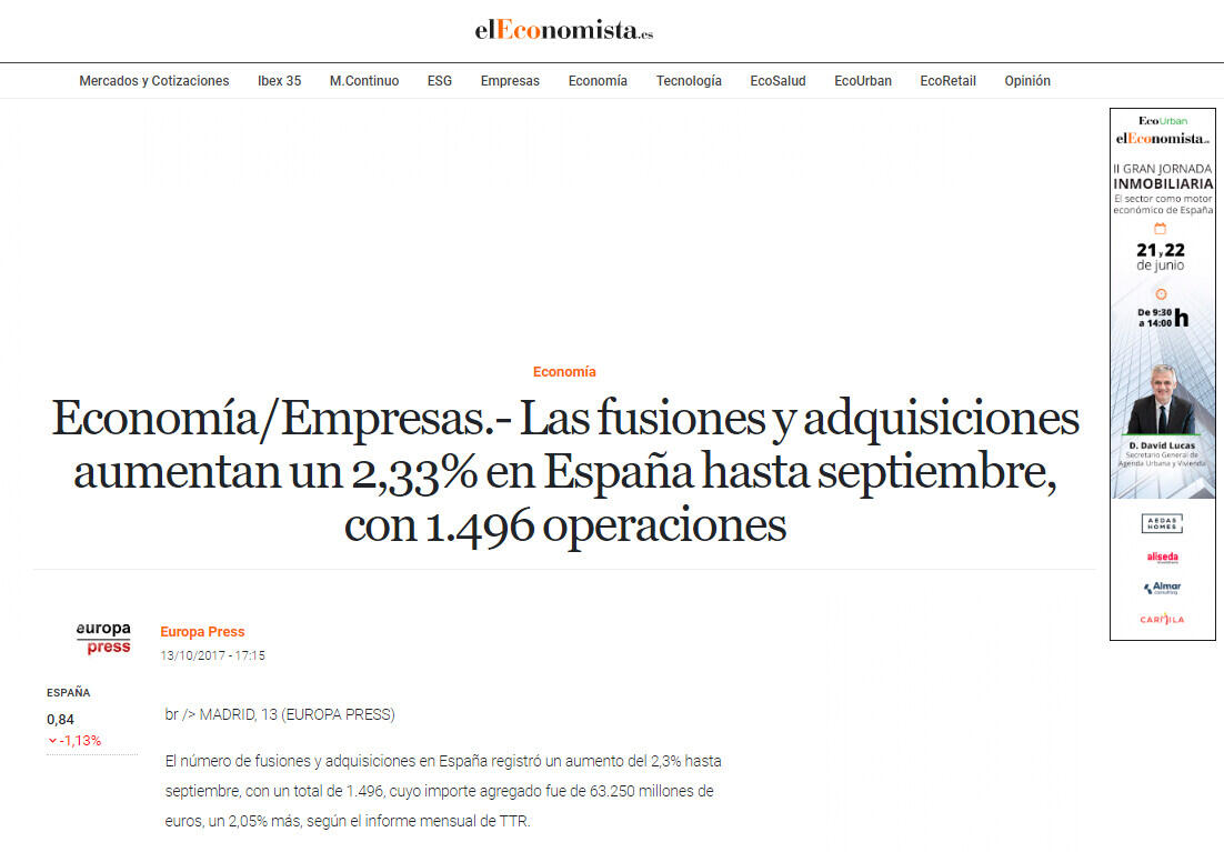En el tercer trimestre se contabilizaron 420 fusiones y adquisiciones anunciadas o cerradas, con un valor conjunto de 9.865 millones de euros, lo que supone una caída del 13,93% en el número de operaciones y del 55,91% en su importe, con respecto al mismo periodo de 2016. TTR ha seleccionado la adquisición del control de Cortefiel por parte de CVC Capital Partners y PAI Partners, valorada en 358 millones de euros, como transacción destacada del trimestre.