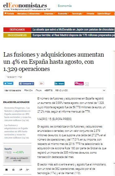 - El número de fusiones y adquisiciones en España registró un aumento del 3,99% hasta agosto, con un total de 1.329, cuyo importe agregado fue de 59.778 millones de euros, un 27,2% más, según el informe mensual de TTR.