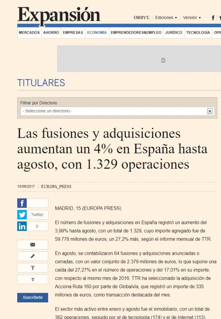 En agosto, se contabilizaron 64 fusiones y adquisiciones anunciadas o cerradas, con un valor conjunto de 2.379 millones de euros, lo que supone una caída del 27,27% en el número de operaciones y del 17,01% en su importe, con respecto al mismo mes de 2016. TTR ha seleccionado la adquisición de Acciona Ruta 160 por parte de Globalvía, que registró un importe de 335 millones de euros, como transacción destacada del mes.